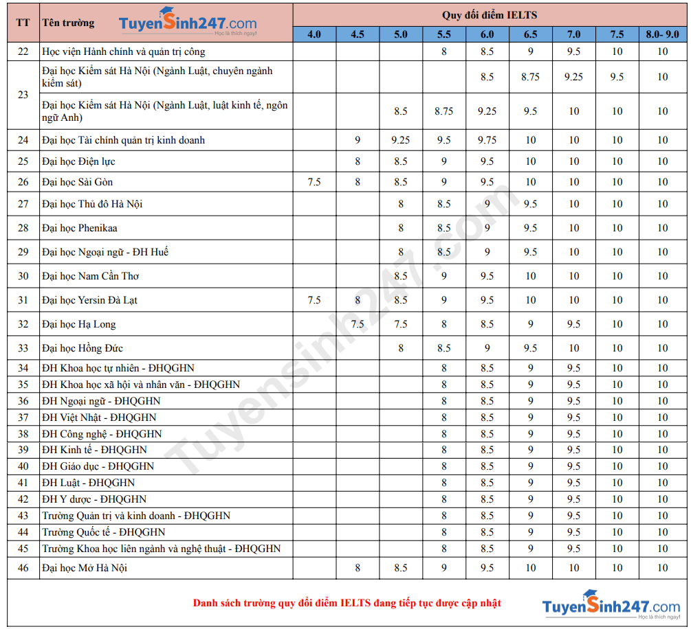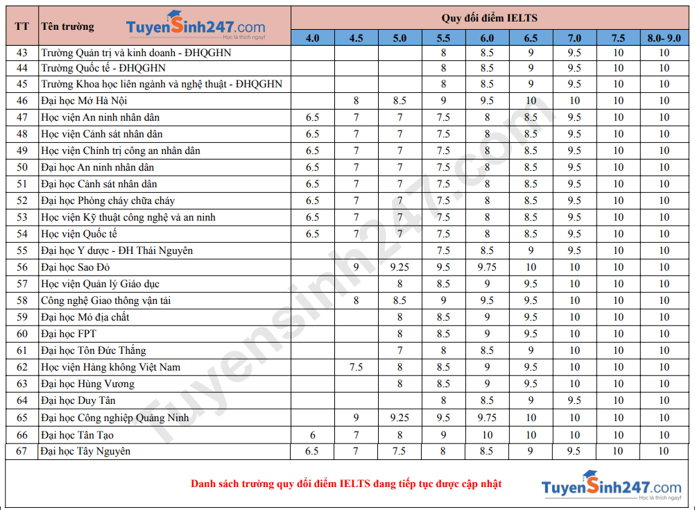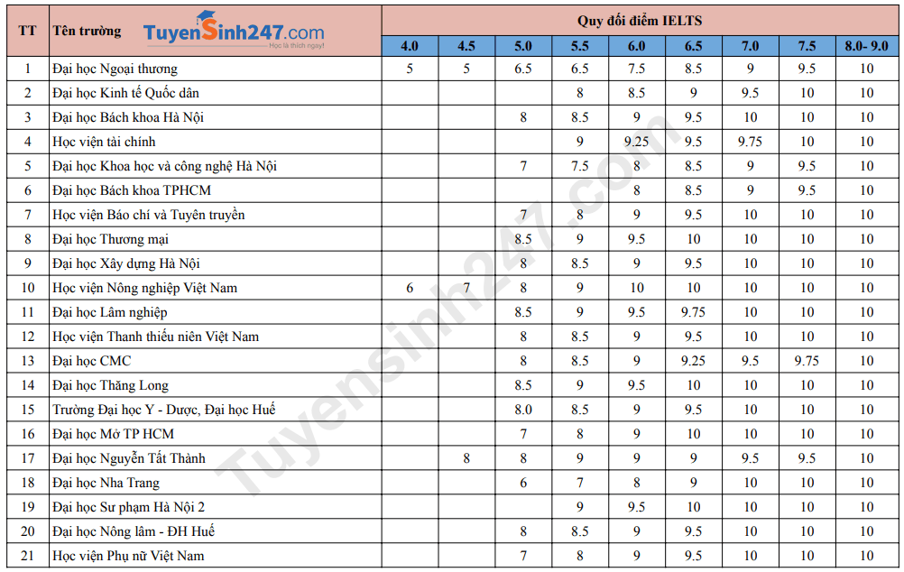 Danh sách trường xét và quy đổi điểm IELTS 2026