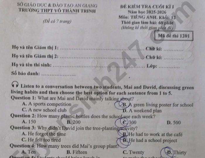 Đề kiểm tra cuối học kì 1 lớp 12 môn Anh năm học 2025 - 2026 của trường THPT Võ Thành Trinh, tỉnh An Giang.