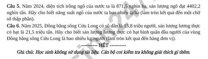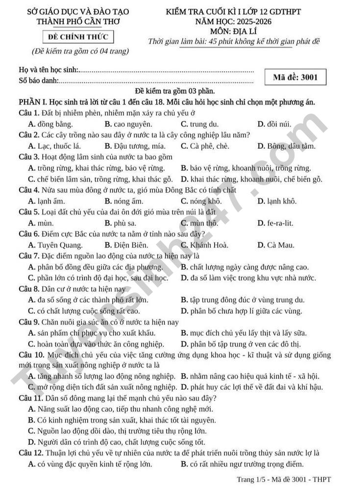 Đề chính thức kiểm tra cuối kì 1 lớp 12 môn Địa năm học 2025 - 2026 Sở GD&ĐT thành phố Cần Thơ, các em tham khảo nhé!