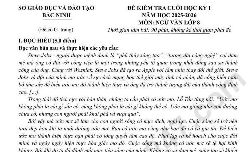 Đề thi HK1 lớp 8 môn Văn 2025 - Sở GD Bắc Ninh (Có đáp án)