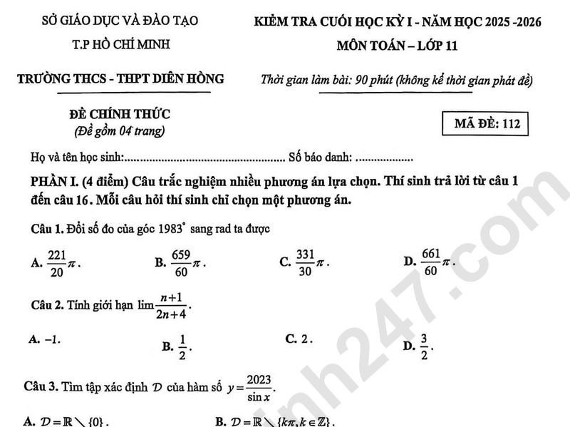 Dưới đây là chi tiết đề thi học kì 1 năm học 2025 - 2026 môn Toán lớp 11 của trường THCS-THPT Diên Hồng, TPHCM.