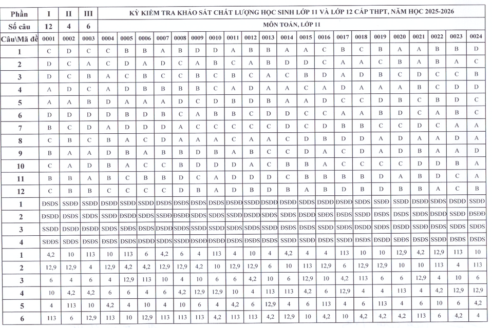 Đáp án đề thi khảo sát lớp 11 môn Toán 2026 - Hà Nội