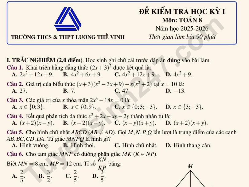 Đề thi kì 1 lớp 8 môn Toán 2025 - THCS & THPT Lương Thế Vinh