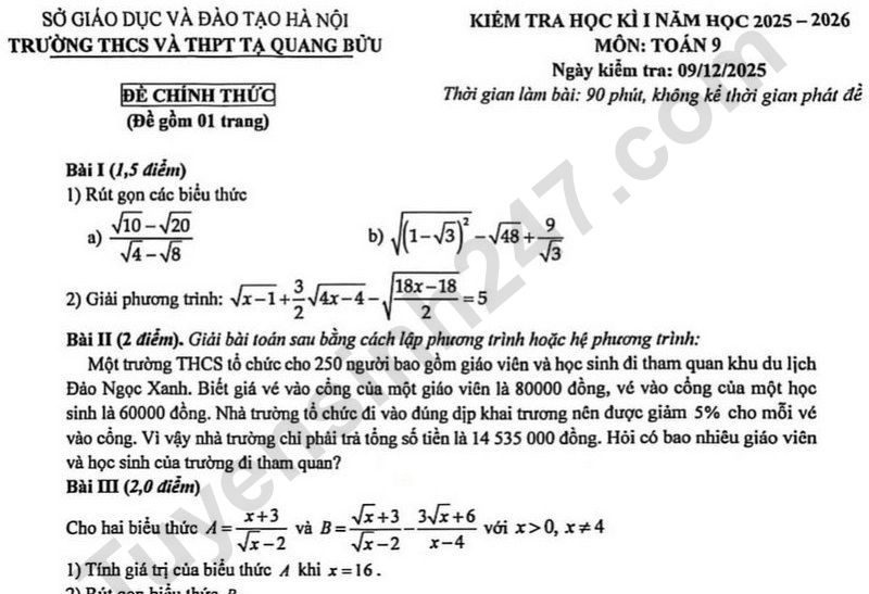 Đề kiểm tra học kì 1 năm học 2025 - 2026 môn Toán lớp 9, trường THCS THPT Tạ Quang Bửu, Hà Nội.