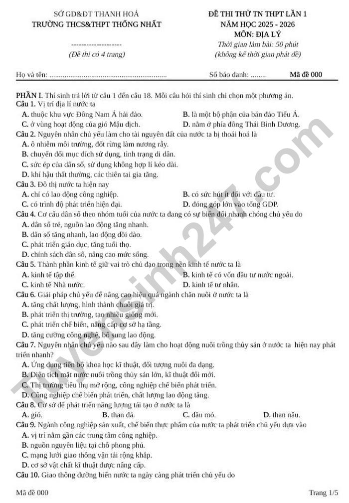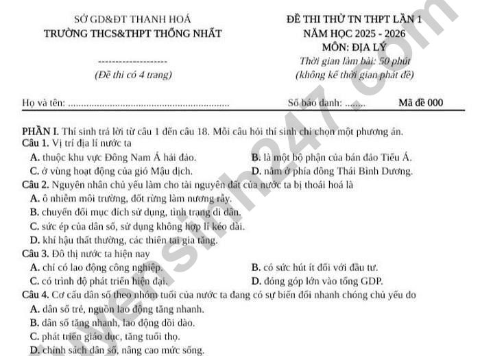 Đề thi thử TN THPT 2026 lần 1 môn Địa - THCS&THPT Thống Nhất
