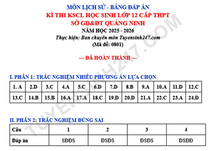 Đáp án đề thi thử tốt nghiệp môn Sử 2026 - Sở GD Quảng Ninh