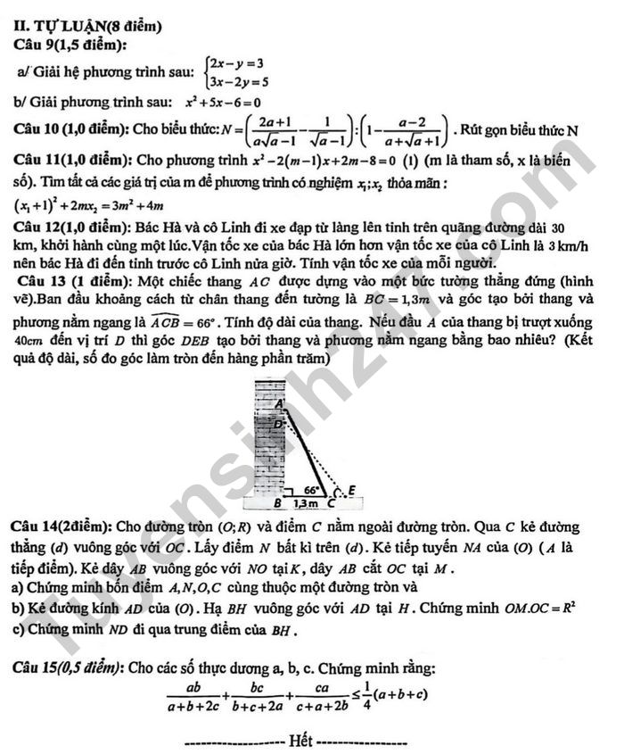 Câu 12(1,0 điểm): Bác Hà và cô Linh đi xe đạp từ làng lên tỉnh trên quãng đường dài 30 km, khởi hành cùng một lúc.Vận tốc xe của bác Hà lớn hơn vận tốc xe của cô Linh là 3 km/h nên bác Hà đi đến tinh trước cô Linh nửa giờ. Tính vận tốc xe của mỗi người.