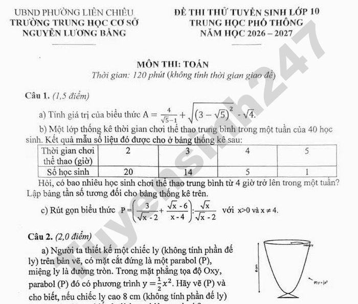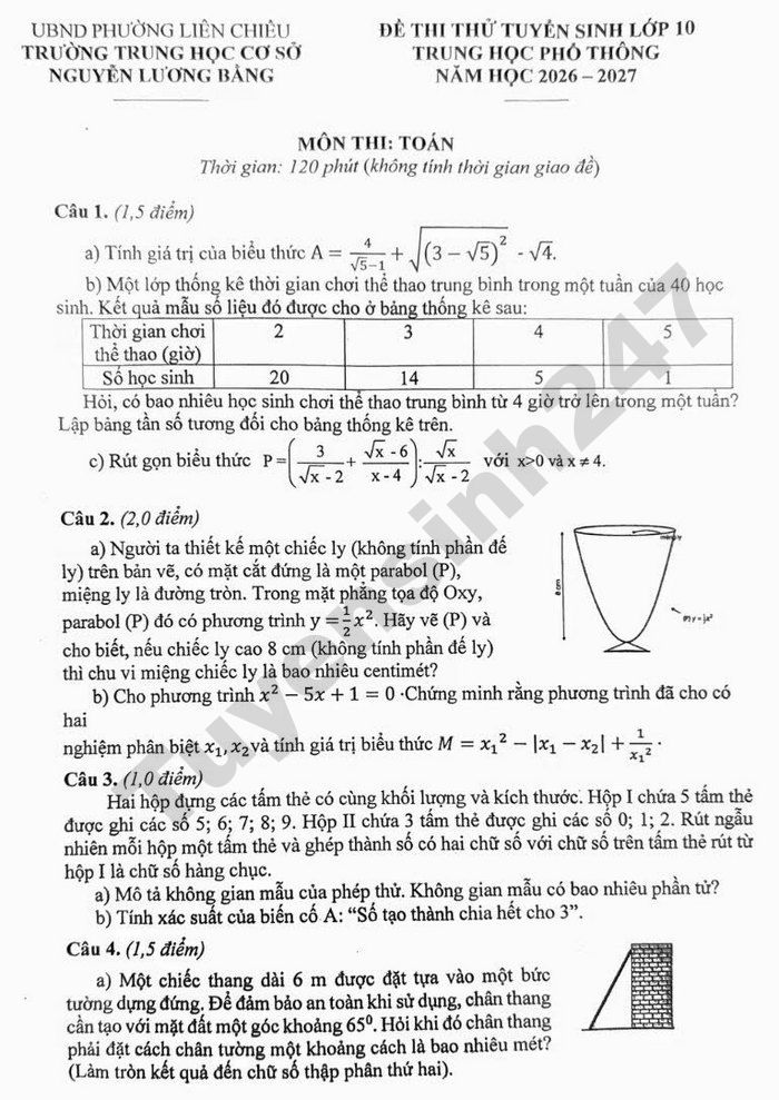 Tham khảo dưới đây đề thi thử vào lớp 10 môn Toán của trường THCS Nguyễn Lương Bằng, phường Liên Chiểu năm học 2026-2027.