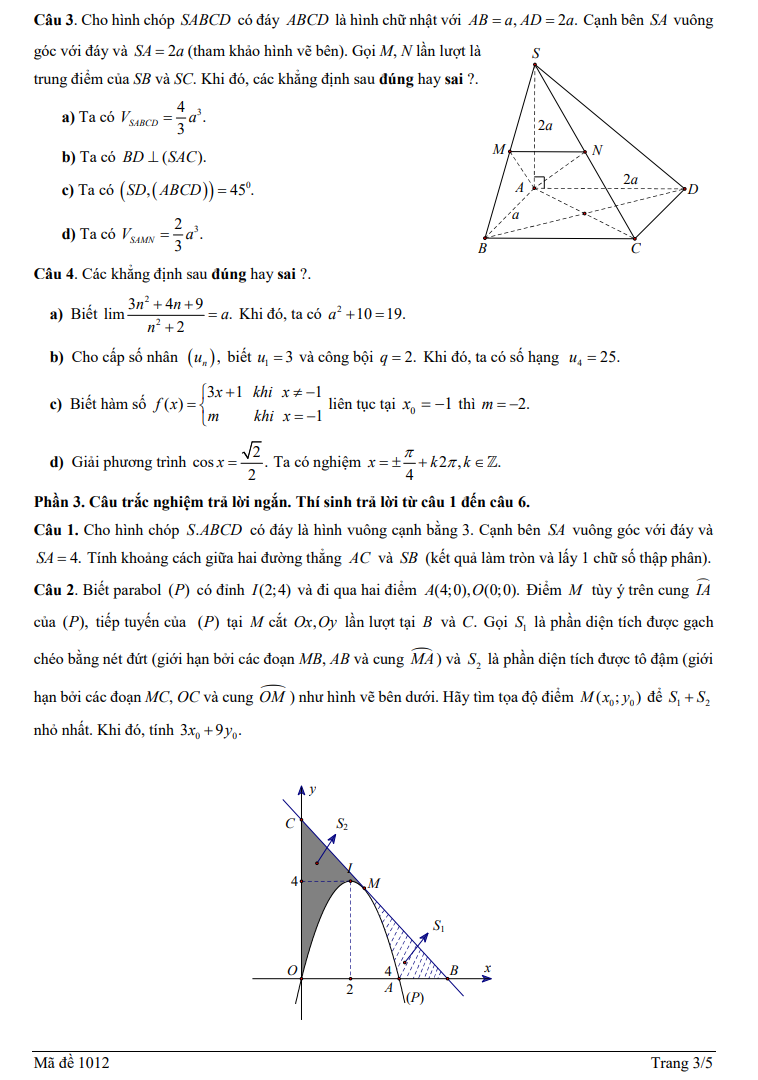 Chương 4 (Nguyên hàm, tích phân và ứng dụng): 3 câu