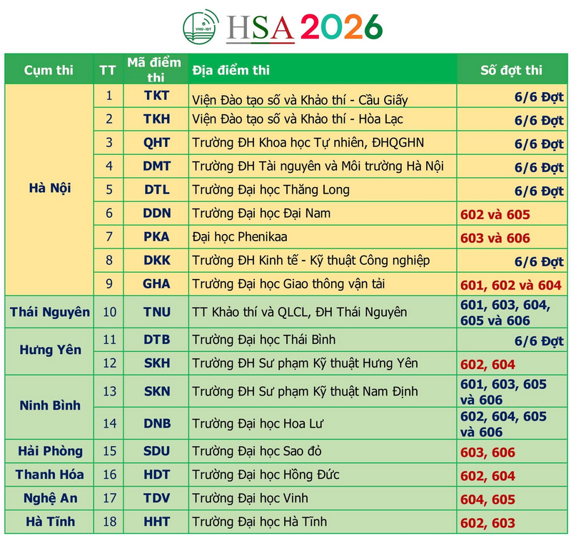 Những địa điểm thi đánh giá năng lực Hà Nội 2026, địa điểm thi HSA 2026 diễn ra tại những tỉnh nào, trường nào? Thời gian chi tiết về các đợt thi ĐGNL? Chi tiết cụ thể được cập nhật bên dưới.