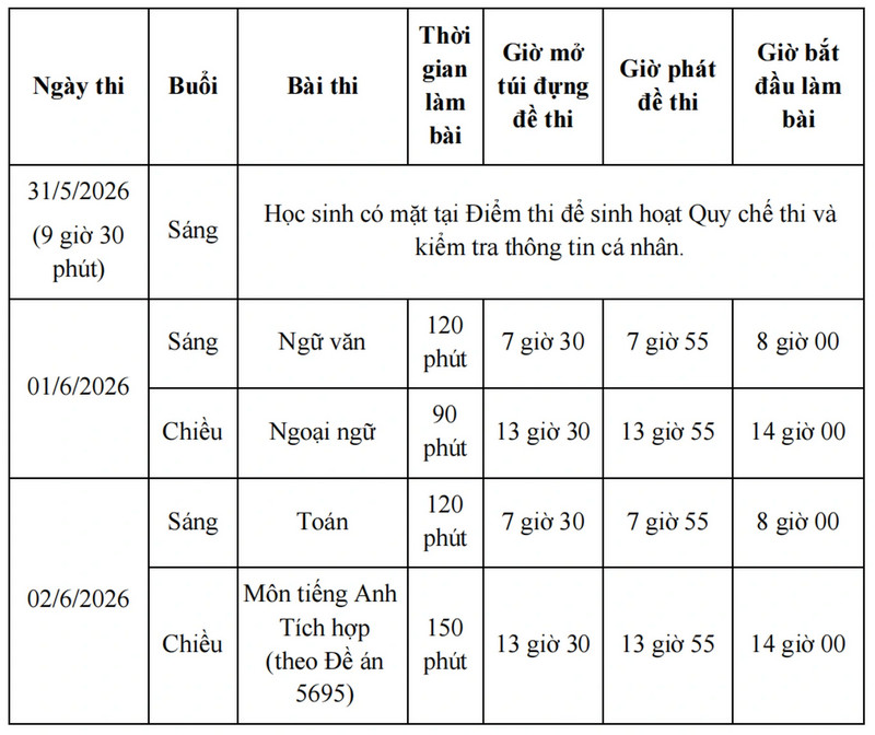 Trong đó, ngày 1/6, buổi sáng thí sinh dự thi môn ngữ văn (120 phút) và buổi chiều dự thi môn ngoại ngữ (90 phút).