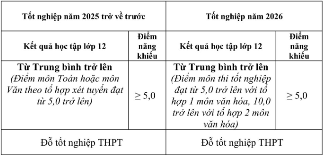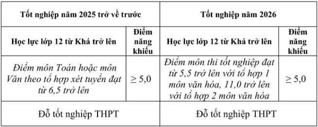 - Điểm môn năng khiếu đạt từ 5,0 trở lên (thang điểm 10).