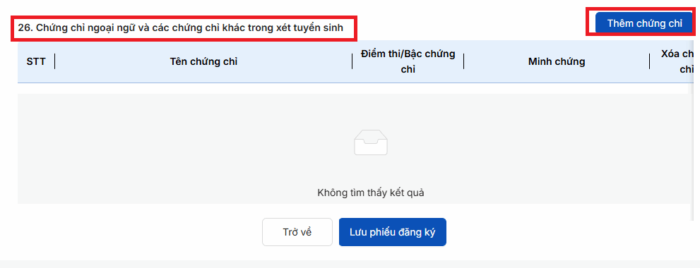 -> Dù mục 14 mình đã up chứng chỉ ngoại ngữ lên rồi thì đến mục 26 (Chứng chỉ ngoại ngữ và các chứng chỉ khác trong xét tuyển sinh) cũng vẫn phải up chứng chỉ ngoại ngữ lên. Vì mục 26 này dùng để xét tuyển vào các trường đại học.