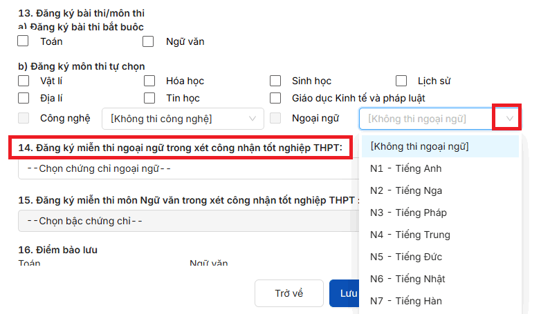 Thí sinh nếu muốn dùng chứng chỉ ngoại ngữ để miễn thi ngoại ngữ trong xét tốt nghiệp THPT 2026 thì ở mục 13 sẽ không tích chọn môn thi ngoại ngữ và để là không thi ngoại ngữ.