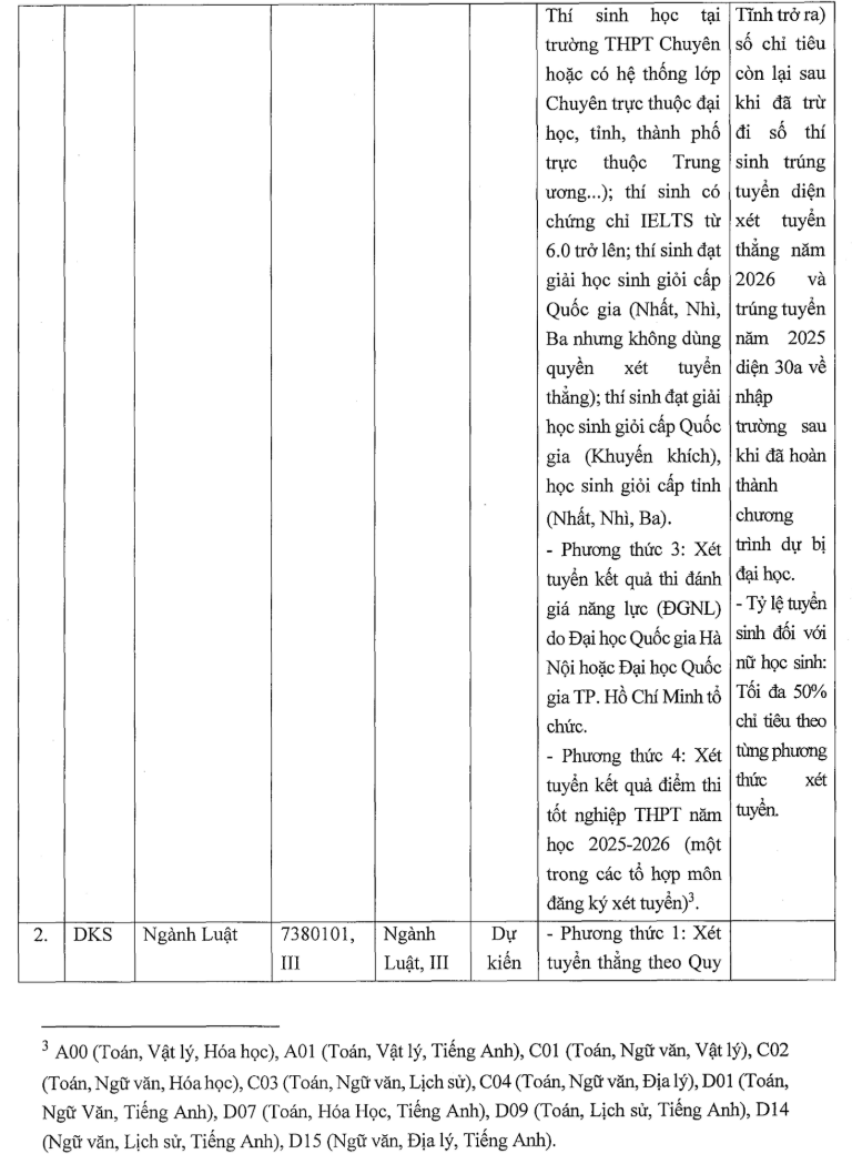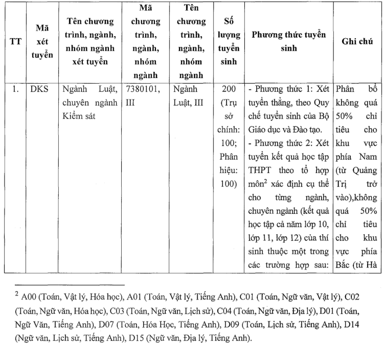 + Ngành Luật, chuyên ngành Kiểm sát và ngành Luật, ngành Luật kinh tế gồm: A00 (Toán, Vật lý, Hóa học), A01 (Toán, Vật lý, Tiếng Anh), C01 (Toán, Ngữ văn, Vật lý), CO2 (Toán, Ngữ văn, Hóa học), C03 (Toán, Ngữ văn, Lịch sử), C04 (Toán, Ngữ văn, Địa lý), D01 (Toán, Ngữ văn, Tiếng Anh), D07 (Toán, Hóa học, Tiếng Anh), D09 (Toán, Lịch sử, Tiếng Anh), D14 (Ngữ văn, Lịch sử, Tiếng Anh), D15 (Ngữ văn, Địa lý, Tiếng Anh).