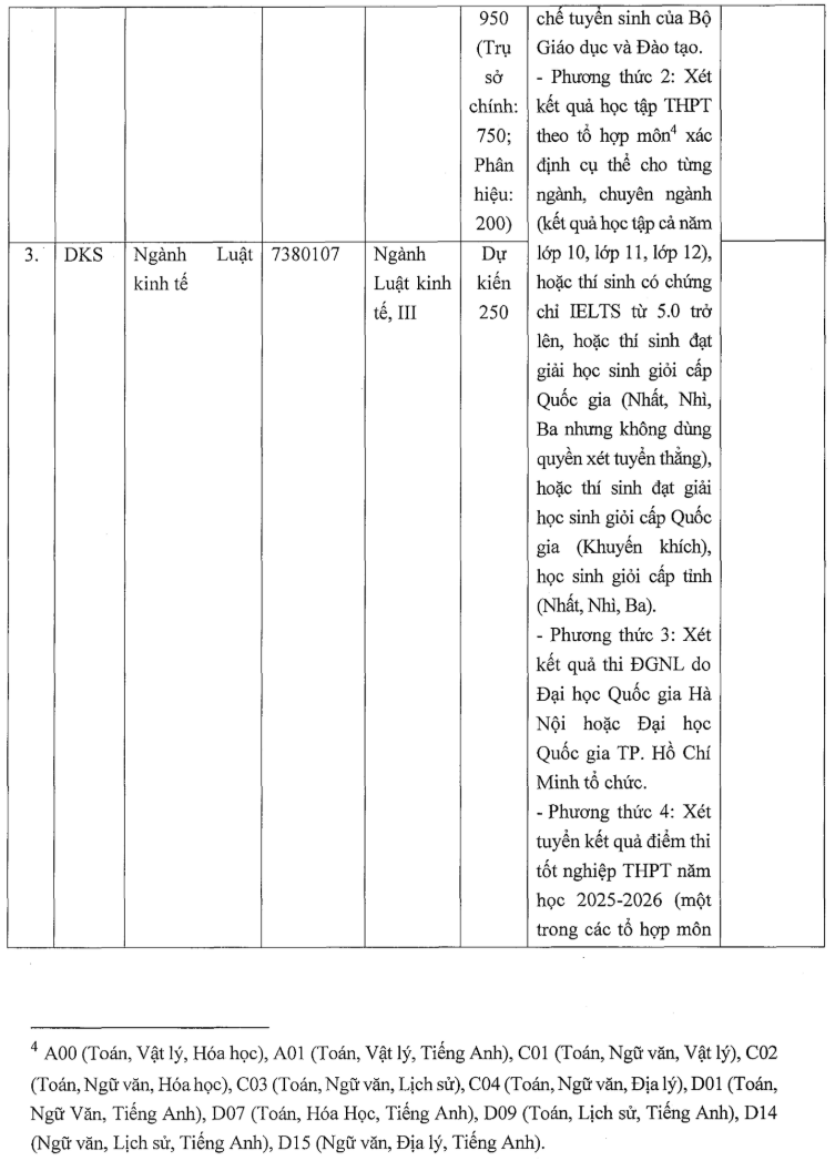+ Đối với ngành Luật, ngành Luật kinh tế, ngành Ngôn ngữ Anh: Xét kết quả học tập THPT theo tổ hợp môn xác định cụ thể cho từng ngành, chuyên ngành (kết quả học tập cả năm lớp 10, lớp 11, lớp 12), hoặc thí sinh có chứng chỉ IELTS từ 5.0 trở lên, hoặc thí sinh đạt giải học sinh giỏi cấp Quốc gia (Nhất, Nhì, Ba nhưng không dùng quyền xét tuyển thẳng), hoặc thí sinh đạt giải học sinh giỏi cấp Quốc gia (Khuyến khích), học sinh giỏi cấp tỉnh (Nhất, Nhì, Ba). Thí sinh đáp ứng các điều kiện chung theo quy định của Bộ Giáo dục và Đào tạo; kết quả rèn luyện, kết quả học tập năm lớp 11 đánh giá từ Khá trở lên và năm lớp 12 đánh giá Tốt (đối với thí sinh là học sinh lớp 12 năm học 2025-2026); học lực, hạnh kiểm xếp loại từ Khá trở lên năm lớp 11 và học lực xếp loại Giỏi, hạnh kiểm xếp loại Tốt năm lớp 12 (đối với thí sinh là học sinh lớp 12 năm học 2023-2024 trở về trước); đáp ứng điều kiện về ngưỡng đầu vào theo quy định của Thông tin tuyển sinh này.