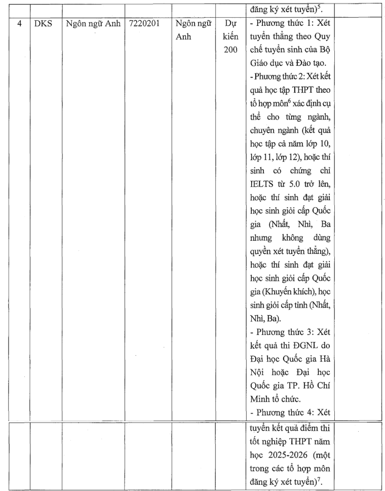 - Đối với ngành Ngôn ngữ Anh: Thí sinh có tổng điểm 03 môn thi tốt nghiệp THPT (kỳ thi trung học nghề đối với đối tượng trung học nghề) năm 2026 đạt tối thiểu từ 15,00 điểm trở lên theo thang điểm 30.