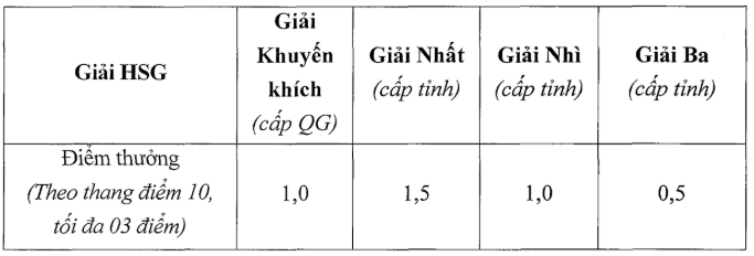 - Điểm xét thưởng: Áp dụng cho học sinh đạt giải học sinh giỏi cấp Quốc gia (Khuyến khích), học sinh giỏi cấp tỉnh (Nhất, Nhì, Ba) được cộng thẳng vào điểm xét tuyển cuối cùng, cụ thể như sau: