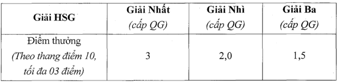 - Điểm thưởng: Áp dụng cho thí sinh đạt giải học sinh giỏi cấp Quốc gia (Nhất, Nhì, Ba nhưng không dùng quyền xét tuyển thẳng) được cộng thẳng vào điểm xét tuyển cuối cùng, cụ thể như sau: