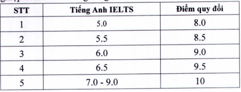 Nhà trường thực hiện quy đổi chứng chỉ ngoại ngữ môn Tiếng Anh tương đương điểm thi tốt nghiệp THPT như trong bảng sau: