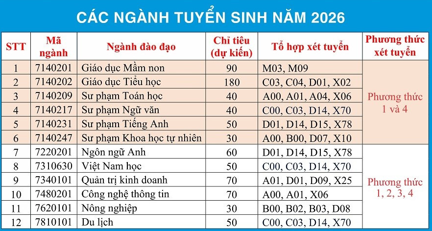 Năm 2026, Trường Đại học Phú Yên tuyển sinh hệ chính quy cho 12 ngành đào tạo (Sư phạm, Kinh tế, CNTT, Du lịch...) với nhiều tổ hợp môn đa dạng. Nhà trường áp dụng 4 phương thức xét tuyển linh hoạt gồm: xét điểm thi tốt nghiệp THPT, học bạ lớp 12, kết quả thi ĐGNL (ĐHQG TP.HCM) và tuyển thẳng theo quy chế.