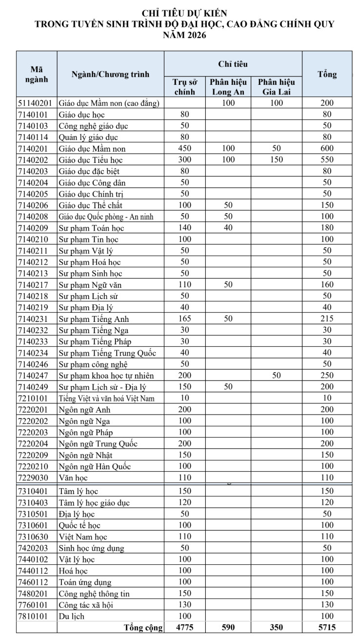 Trường Đại học Sư phạm Thành phố Hồ Chí Minh thông báo phương án tuyển sinh trình độ đại học, cao đẳng chính quy năm 2026 như sau: