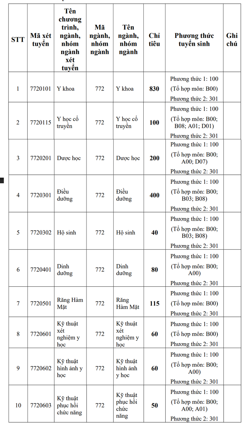 Anh hùng lao động, Anh hùng lực lượng vũ trang nhân dân, Chiến sĩ thi đua toàn quốc được tuyển thẳng vào học đại học một trong các ngành: Y khoa, Y học cổ truyền, Răng Hàm Mặt, Dược học, Điều dưỡng, Hộ sinh, Y tế công cộng,